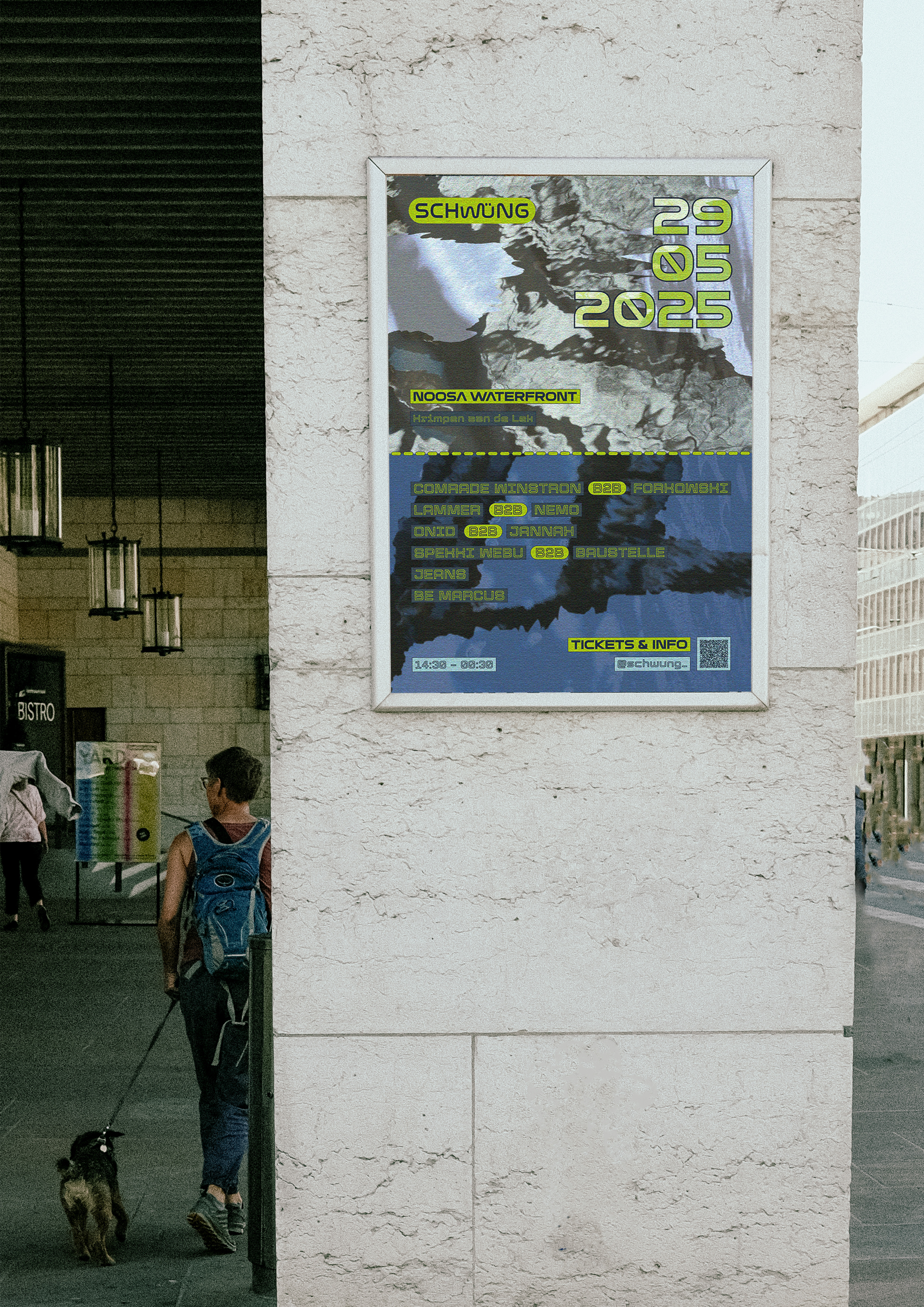 Poster and timetable for party in Krimpen aan de Lek at Noosa Waterfront, hosted by Het SCHwüNG.